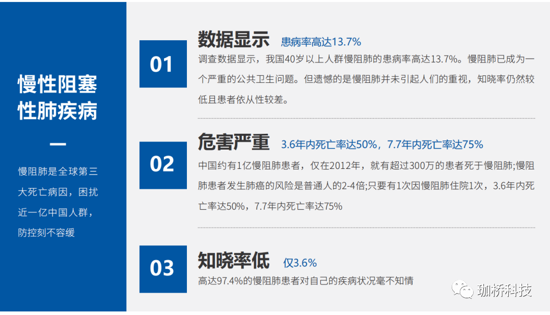 中国患呼吸系统慢性病人数多,死亡率高,家庭负担重,疾病有效防控是关系国计民生的战略问题。中国慢性阻塞性肺疾病,40岁以上人群高达13.7%, 每年有近100万人因病致死,患者年均花费在1.3万元,如果发生急性加重,需额外支付住院费用约1.2万元。由于患者早期的症状不明显,社区医院和家庭缺少肺功能诊疗设备,近90%的患者没有得到及时的诊疗及康复,导致患者反复急性加重,严重影响生命健康和家庭幸福。