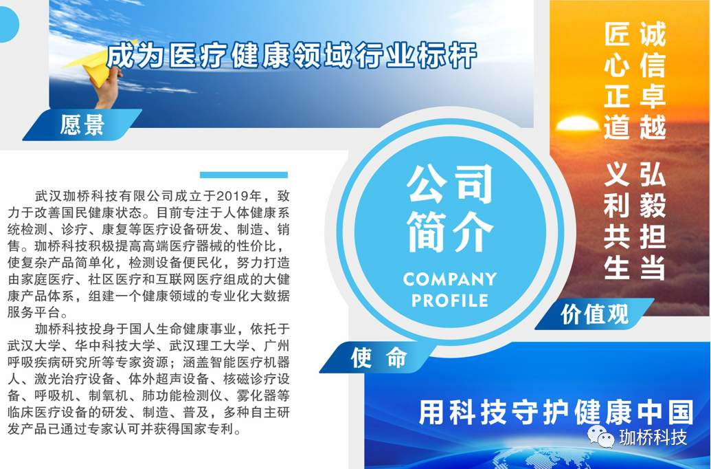 武汉珈桥科技有限公司得到国家呼吸医学中心、呼吸疾病国家重点实验室、中国肺功能联盟主席郑劲平教授等多位专家支持,历时3年研发,发明了国内第一款热敏式肺功能仪,并取得发明及专利26项。肺功能仪是判断慢性阻塞性肺疾病(慢阻肺)、哮喘、ACOS等肺部疾病必备的医疗器械,也是居家检测肺功能、呼吸训练、康复管理的必备医疗设备。