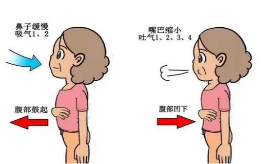 胸部保持不动,吸气时闭嘴,用鼻子去吸气,吸气末屏气数秒钟,吸气时腹隆起,呼气时腹凹陷,呼气时嘴唇成吹口哨状。选择站式或者坐式皆可。